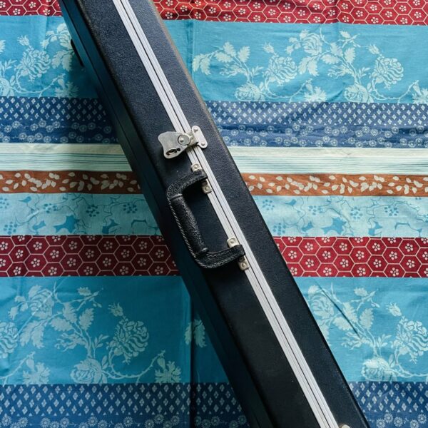 en bon état pour son âge, un rayure sur le vernis est visible en bas du chevalet, les frettes ne sont pas usées mais pourraient être nettoyées (plus visible en bas du manche). Il y a encore le film plastique sur la plaque blanche au dos. La guitare a été suivie par le luthier Caro.