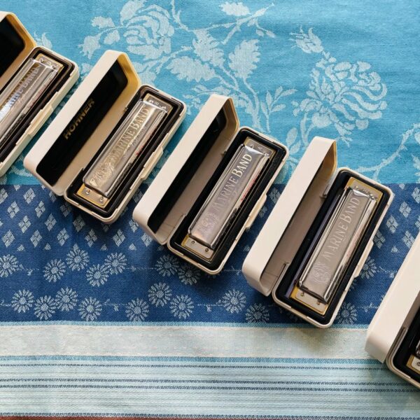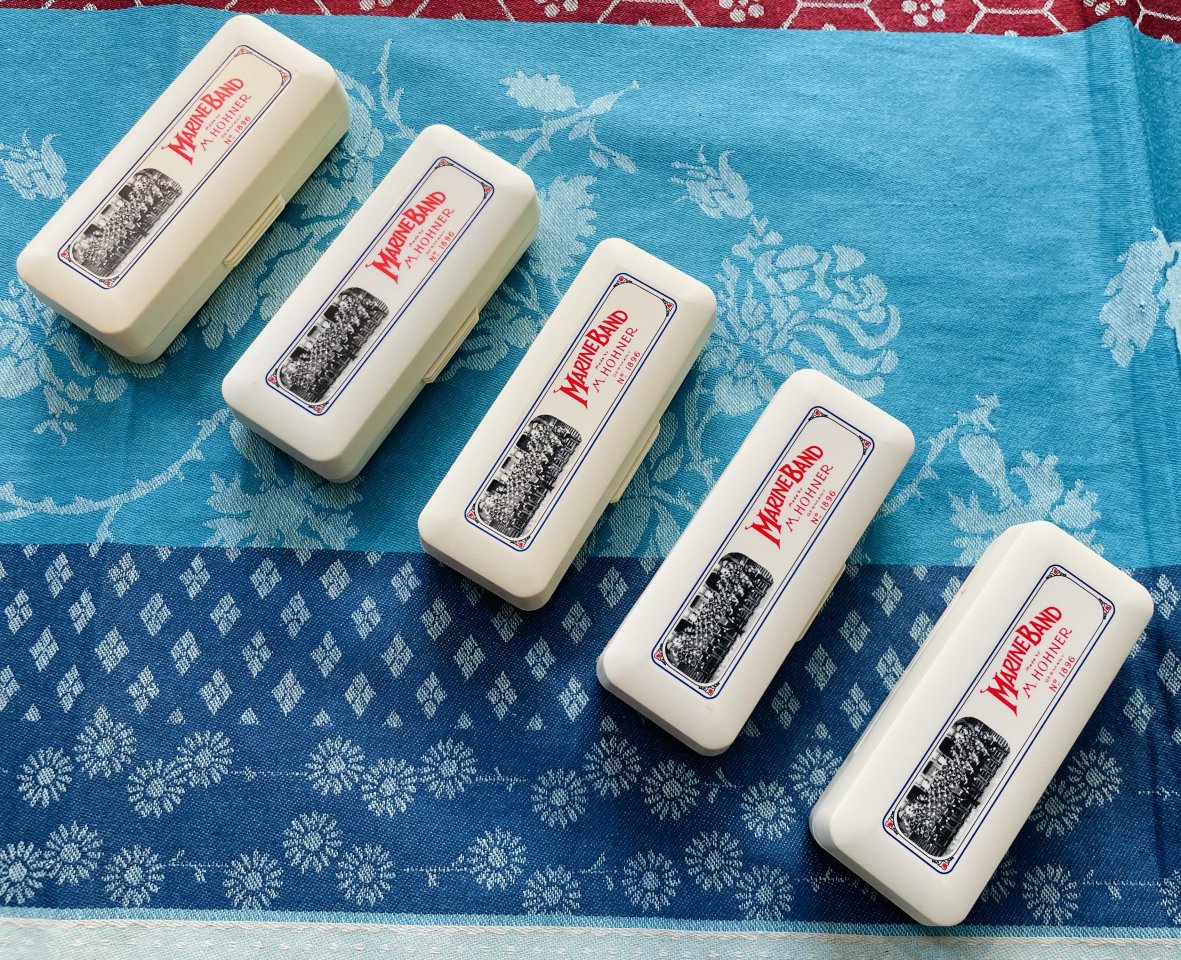 5 Harmonicas diatoniques Hohner Marine Band D / A / B / E / Bb, boites d’origines