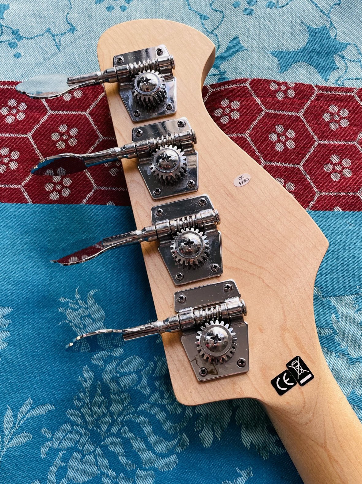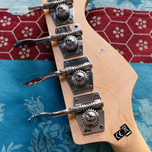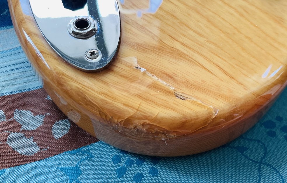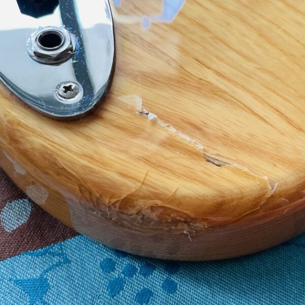 en bon état général malgré un bon impact sur le bord du corps. Fonctionnelle et jouable dans l’état malgré ce choc qui est plus de la cosmétique. Il y a avait encore le film plastique sur le pickguard noir donc aucune rayure dessus. Prix du neuf 180 €.