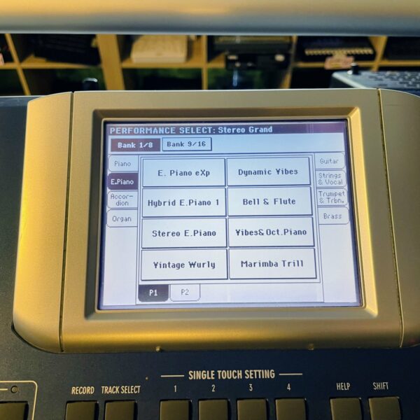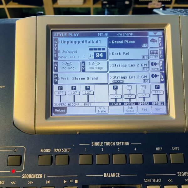 les touches du clavier ont jaunies, certaines ont des traces mais tout est fonctionnel et reste un sympathique clavier arrangeur bien complet. Il reste encore aujourd’hui très intéressant puisqu’il offre de très beaux sons, les enceintes intégrées sont d’une qualité irréprochable, la qualité sonore au casque l’est tout autant (très belle stéréophonie), écran tactile bien fonctionnel pour les rappels rapides des sons et autres fonctions. Idéal pour les débutants mais pas uniquement.