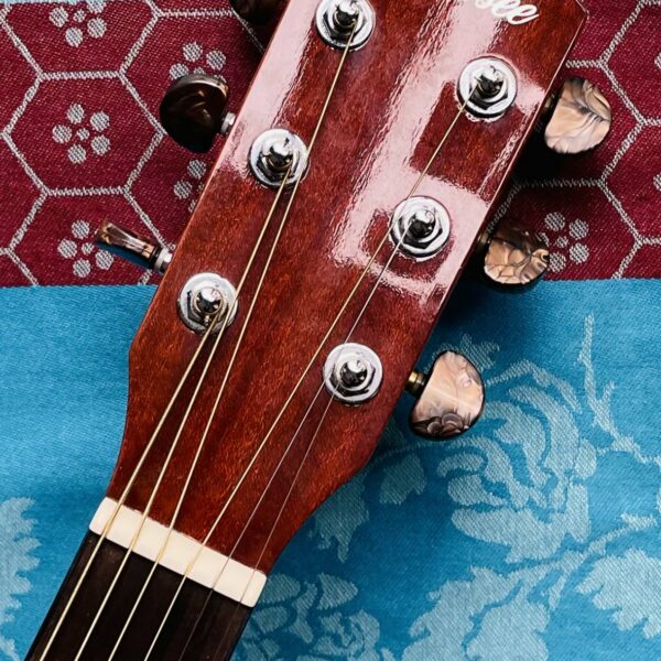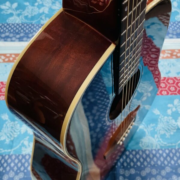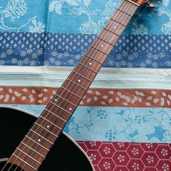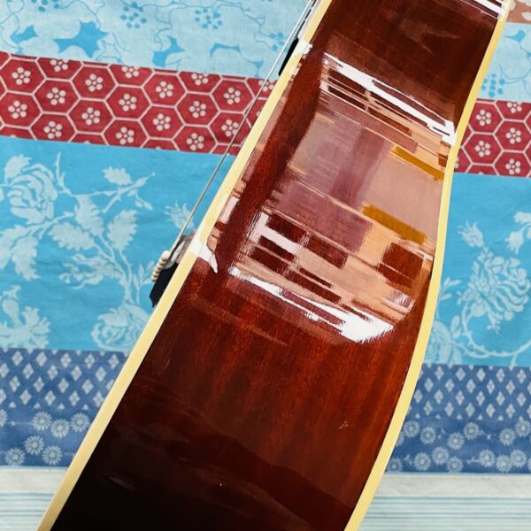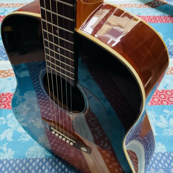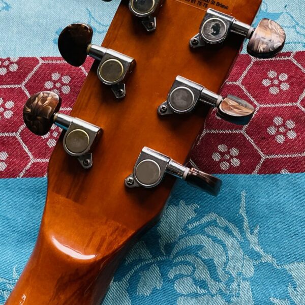en très bon état, la guitare a été réglée chez le luthier Louis Manteau (facture 10.12.25 : cordes neuves Martin, baisse de la hauteur des cordes, sillets de chevalet abaissé, ajustage de la hauteur des cordes au sillet de tête, canaux creusés depuis les chevilles du chevalet jusqu’au sillet, nettoyage et ajustement complet).