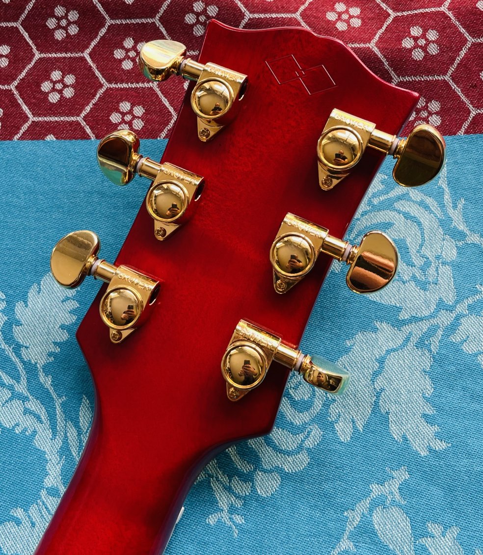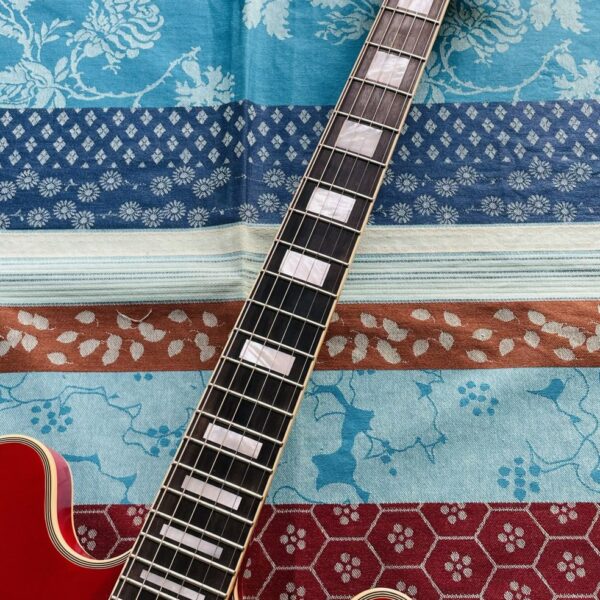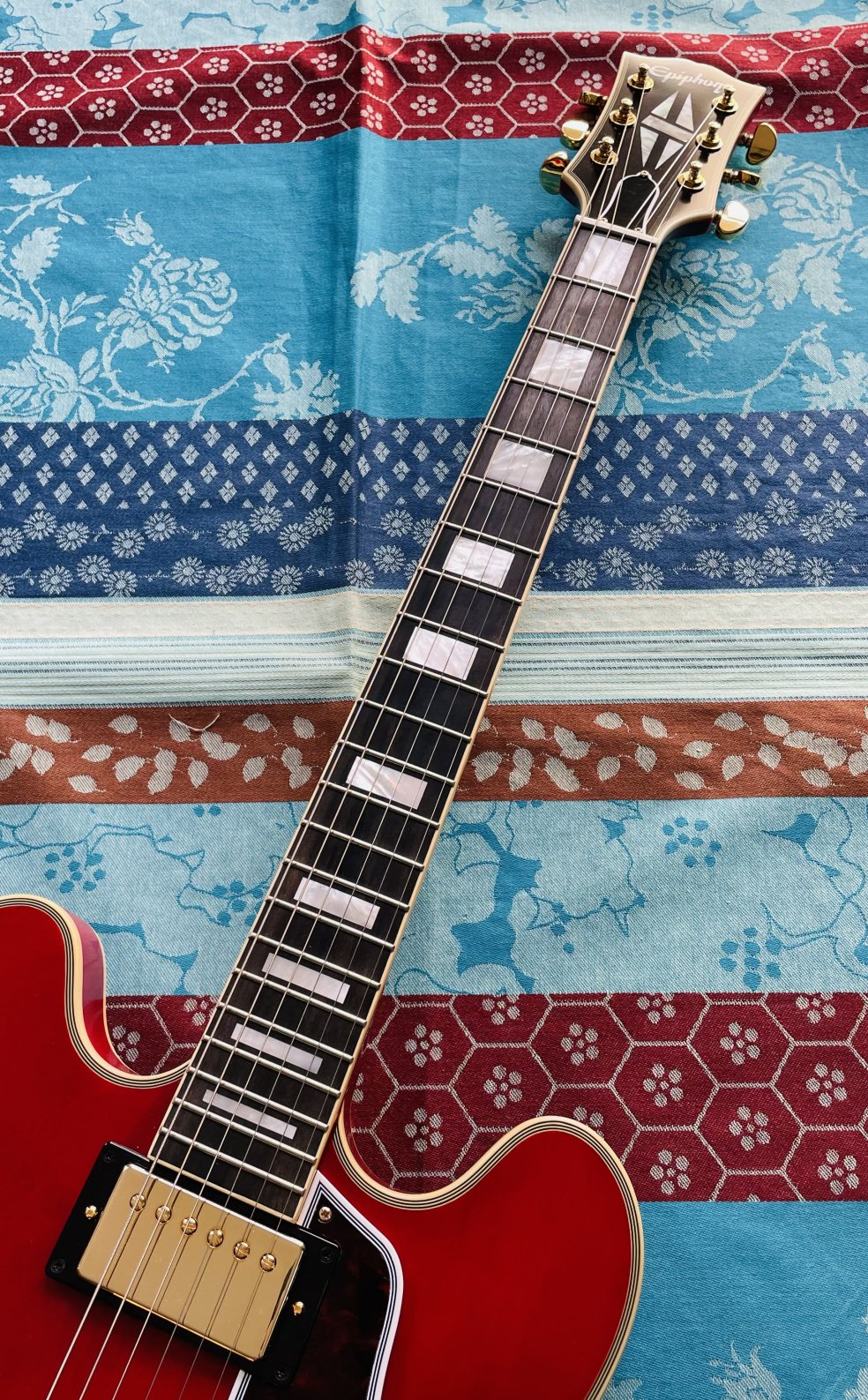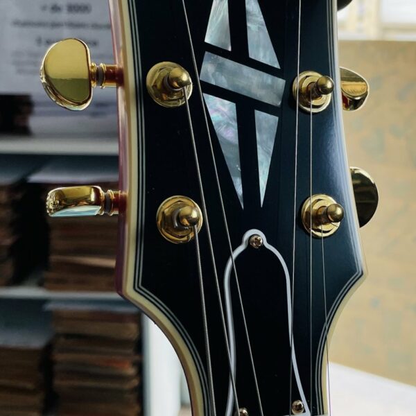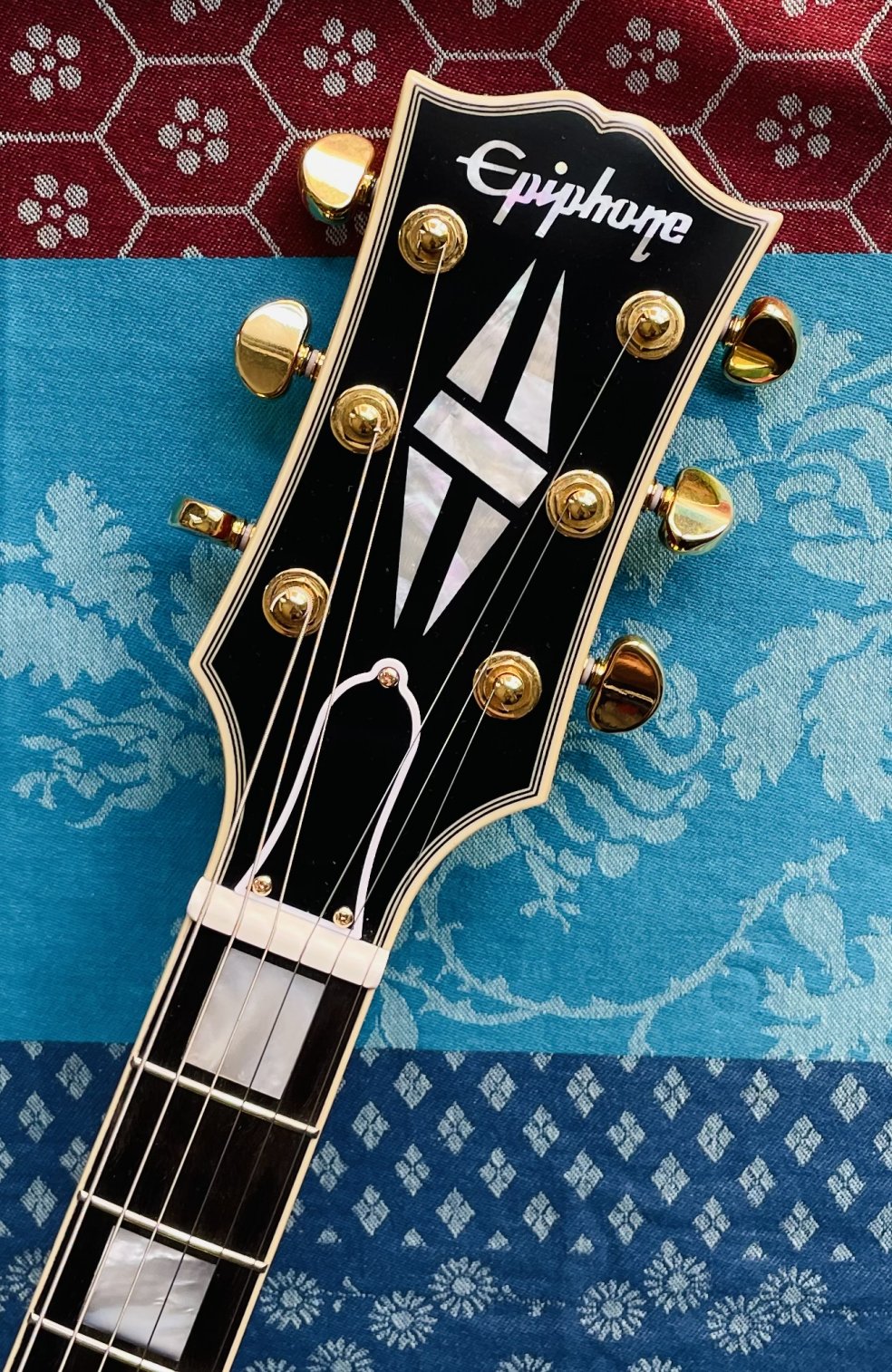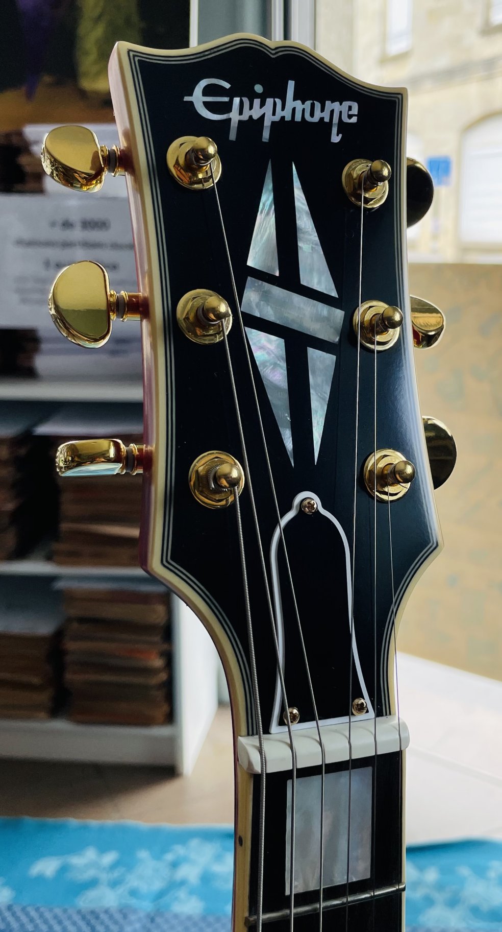 en excellent état (proche du neuf). Achat neuf du 24.06.25 (Starmusic, 1296 € + cordier doré Gibson PBBR-065 de 69 €). Une très belle guitare haut de gamme chez Epiphone avec de très bons micros Custombucker! Notons qu’elle est plus lourde que d’autres modèles.