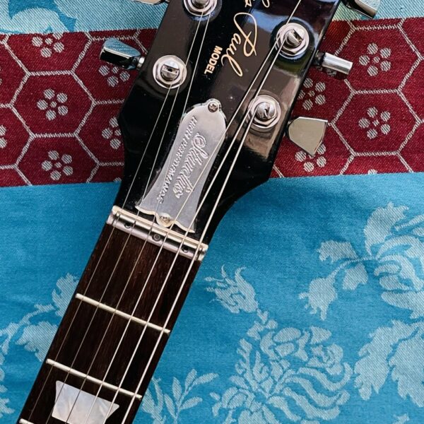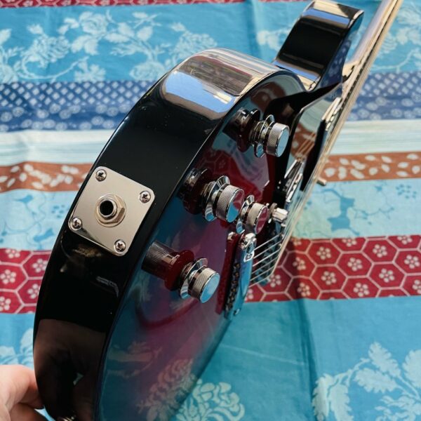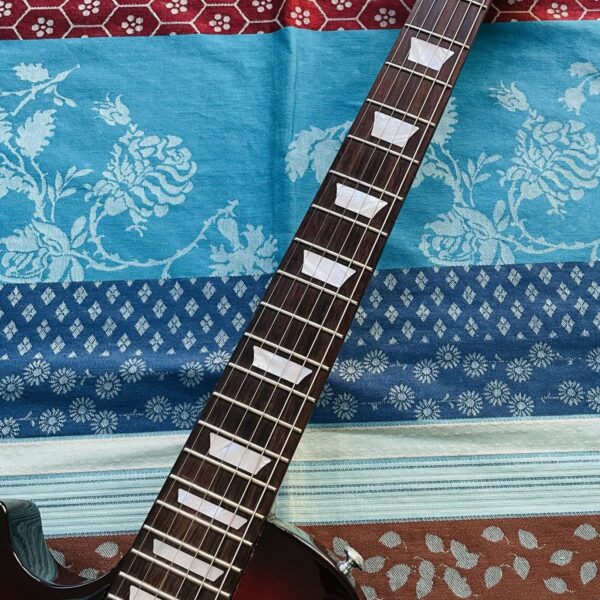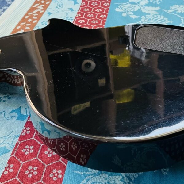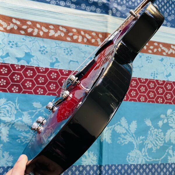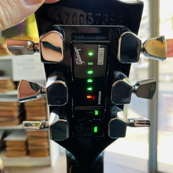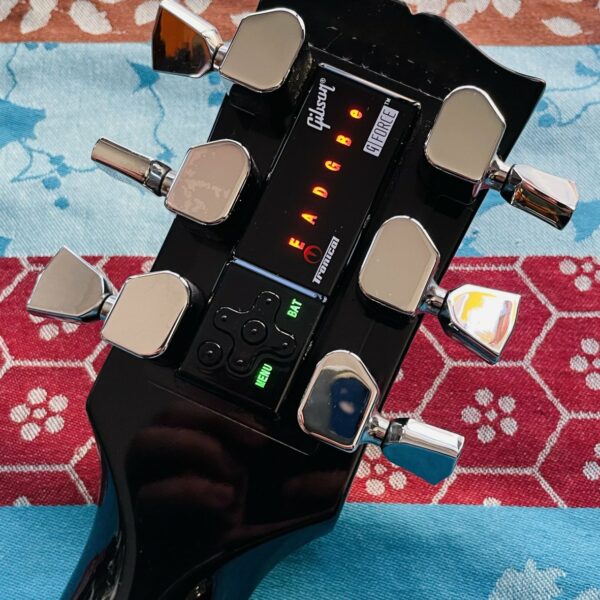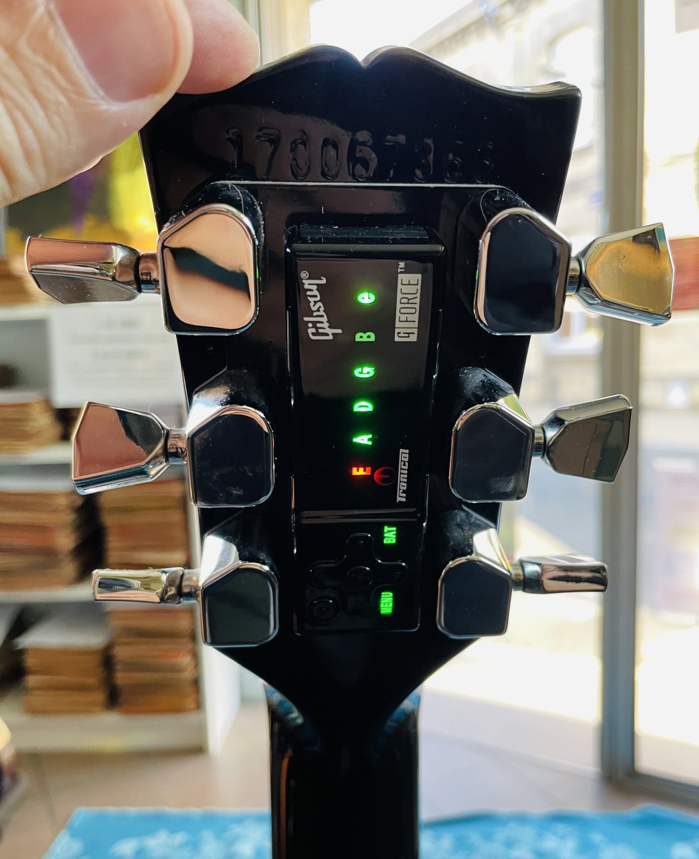en bon état général, juste quelques petites traces bien mineures, les frettes sont en très bons état, ce n’est pas une guitare beaucoup jouée. Testée et fonctionnelle, l’accordeur intégré G-Force est fonctionnel. L’étui est superbe (il y a encore le film plastique dessus)
