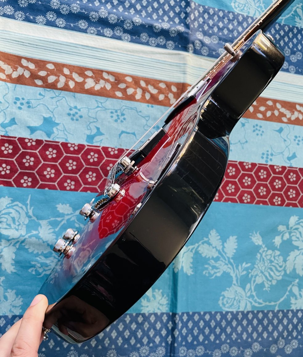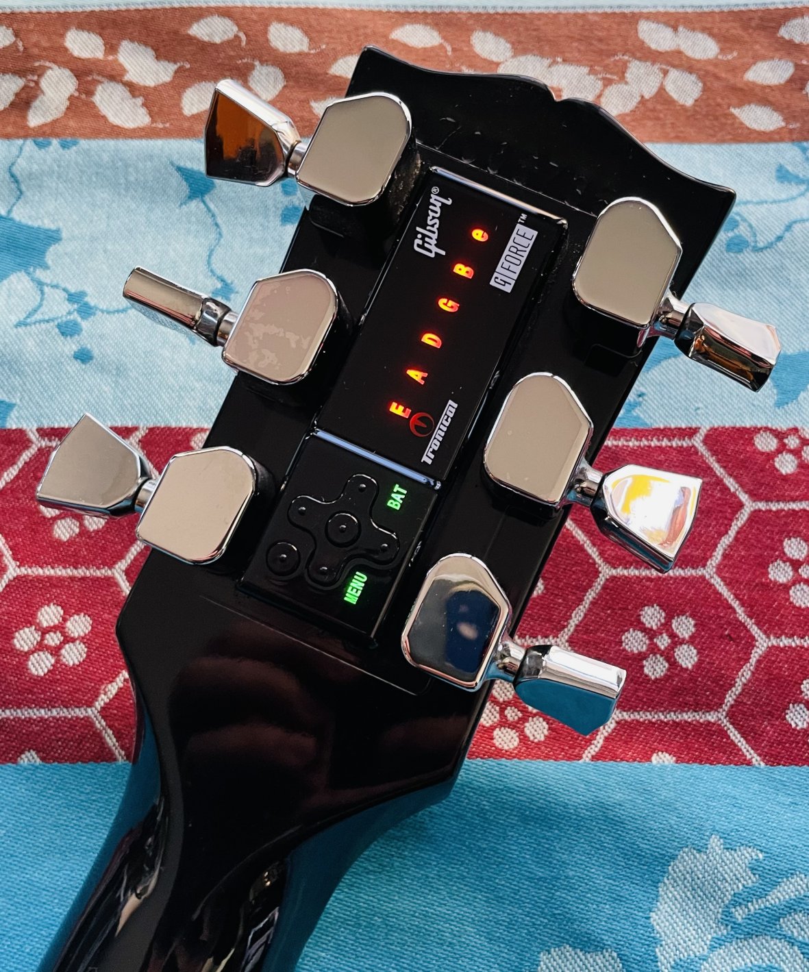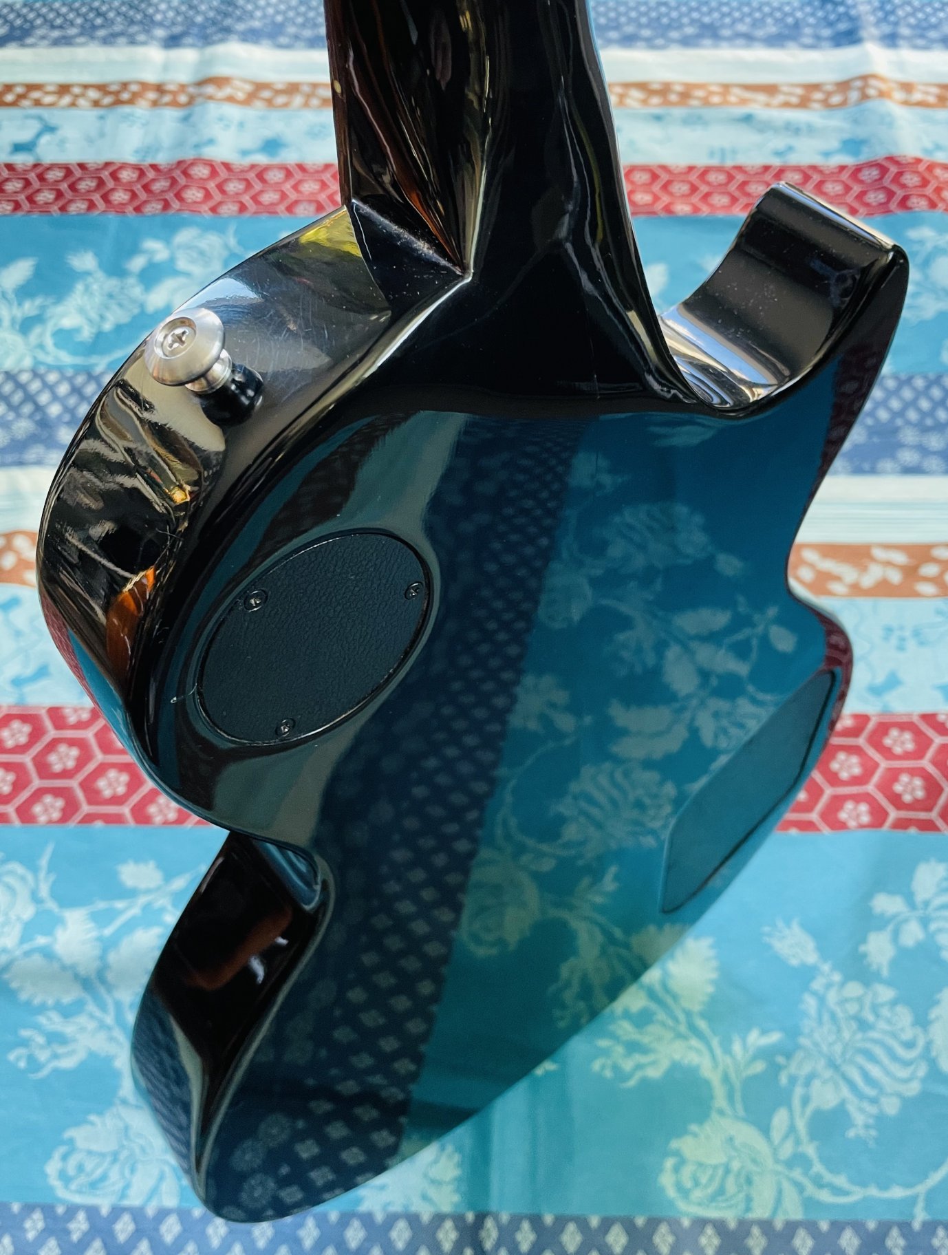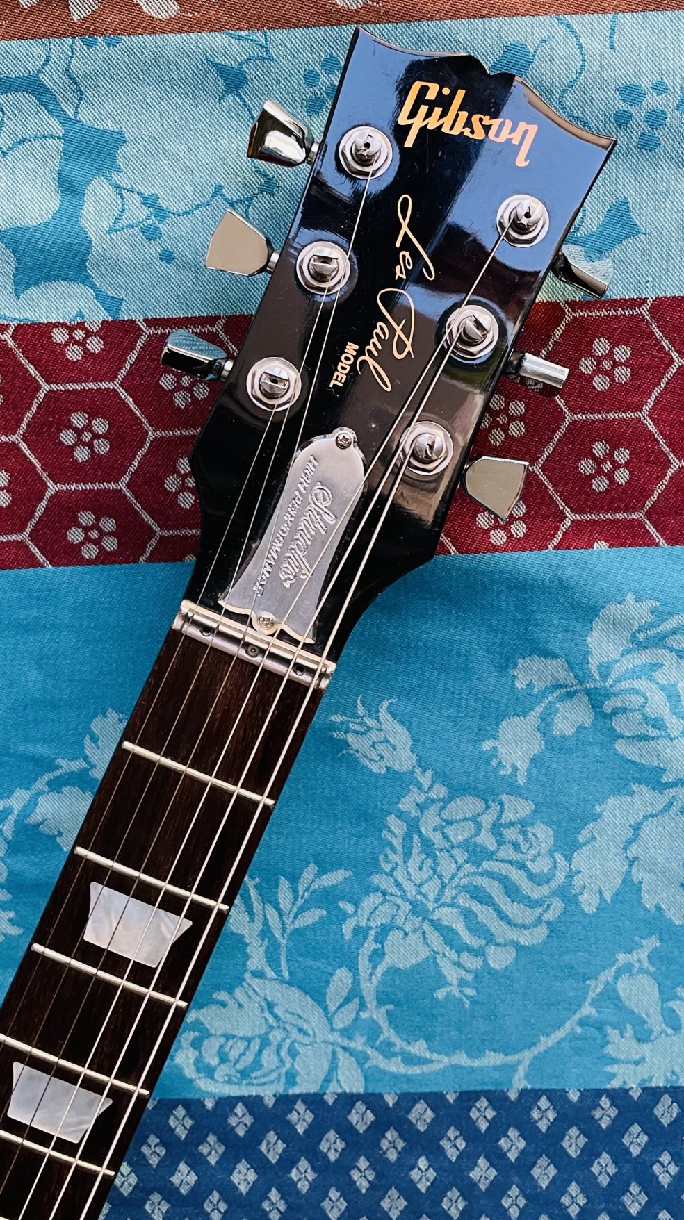 en bon état général, juste quelques petites traces bien mineures, les frettes sont en très bons état, ce n’est pas une guitare beaucoup jouée. Testée et fonctionnelle, l’accordeur intégré G-Force est fonctionnel. L’étui est superbe (il y a encore le film plastique dessus)