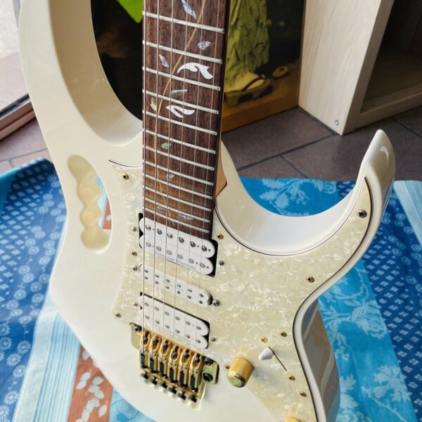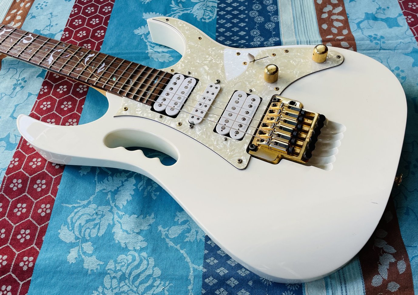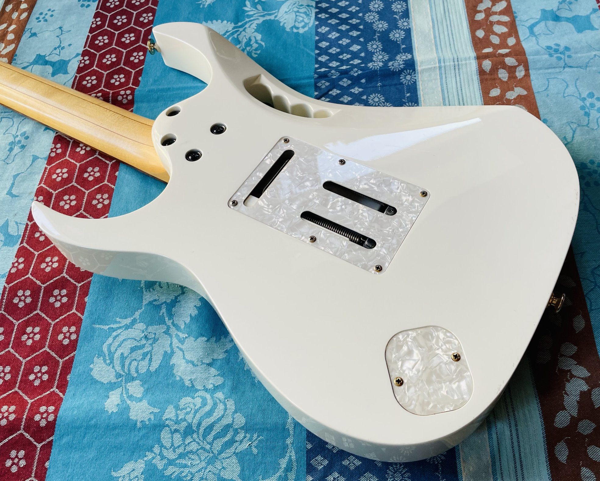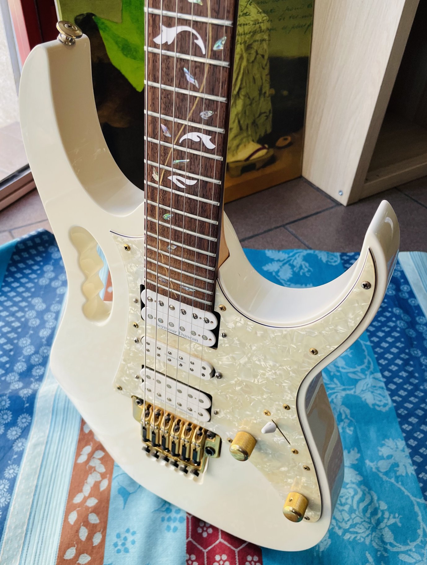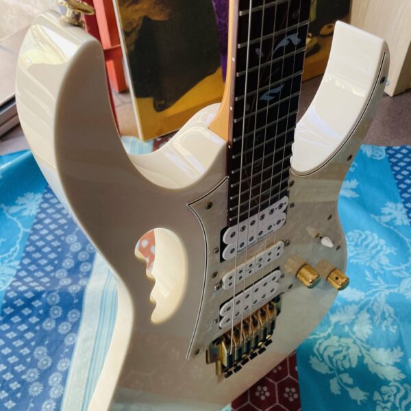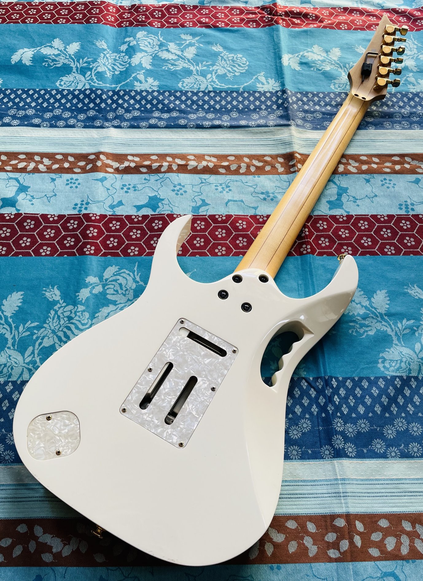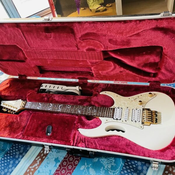 Guitare électrique Ibanez Steve Vai Prestige JEM7V White n°F0621725 (2006, Japan), étui Ibanez, micros posés Seymour Duncan, micros d’origine, étui d’origine Prestige Japan