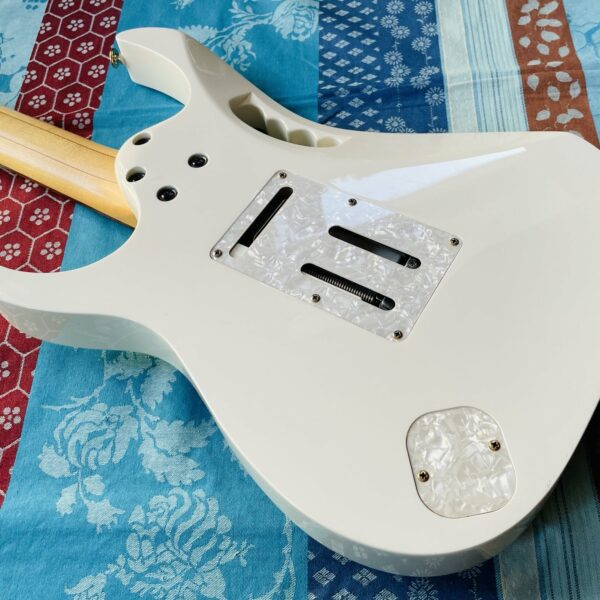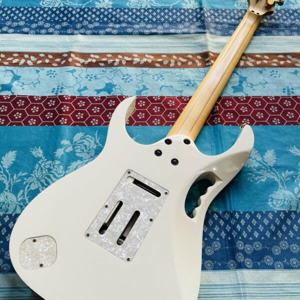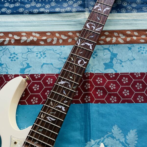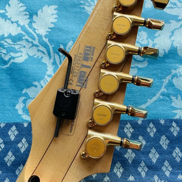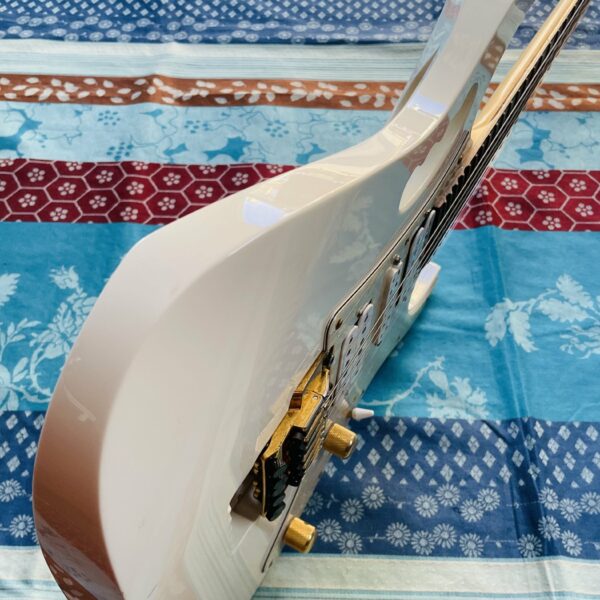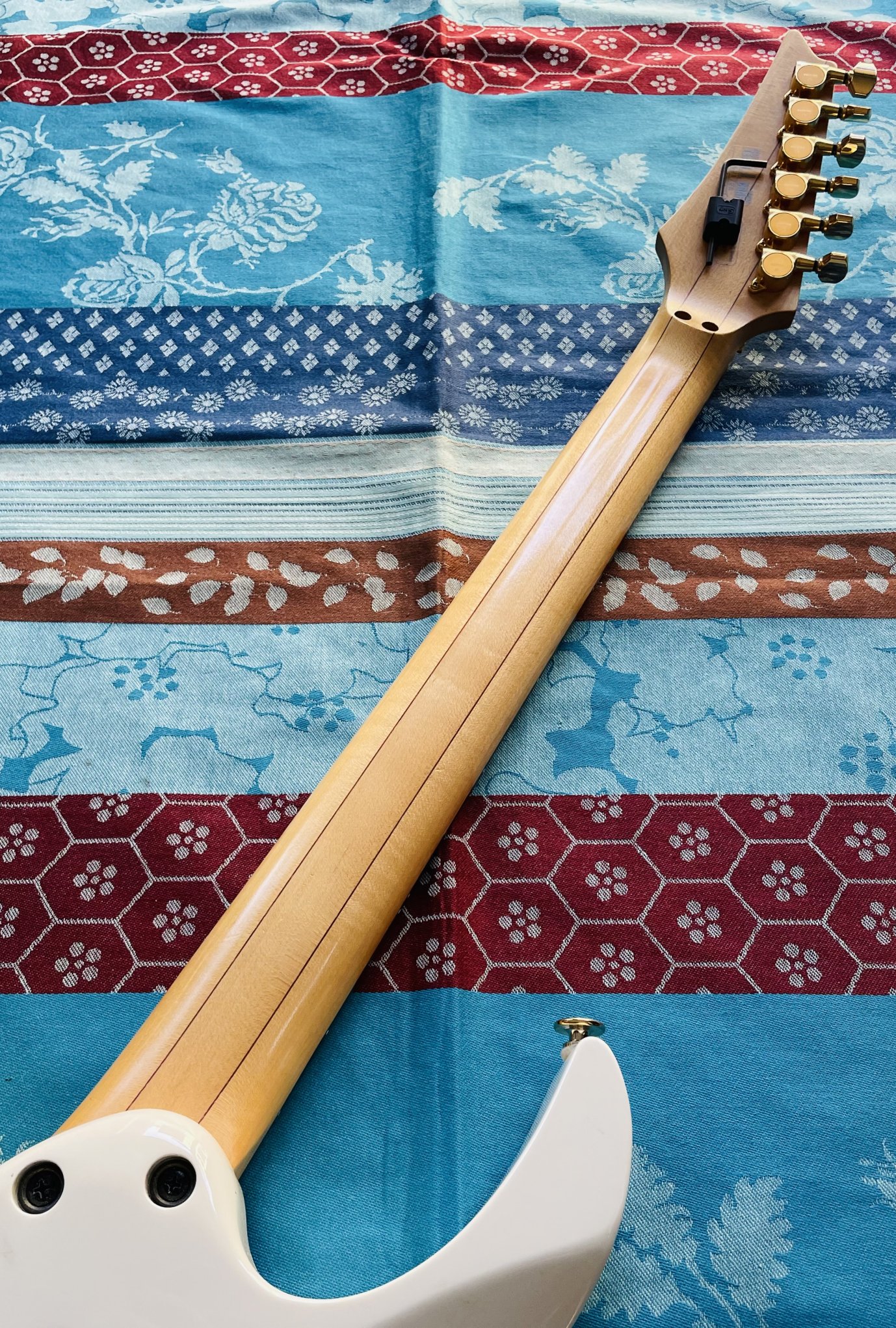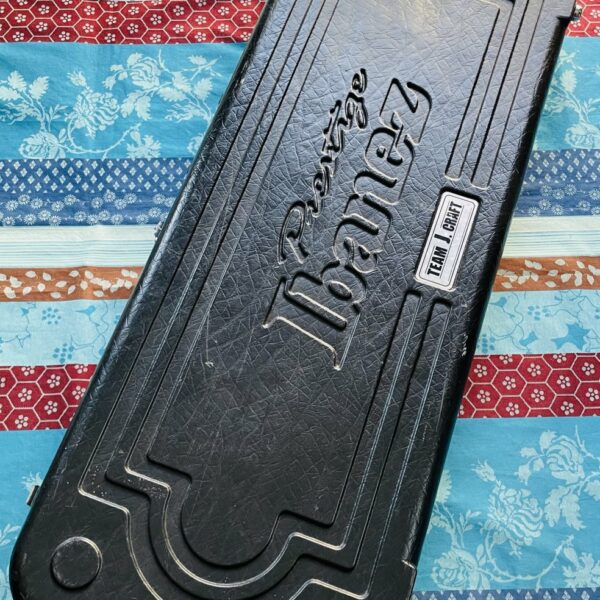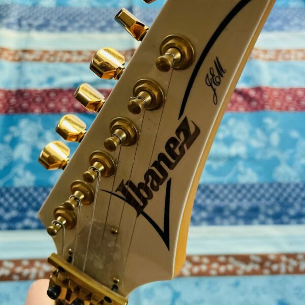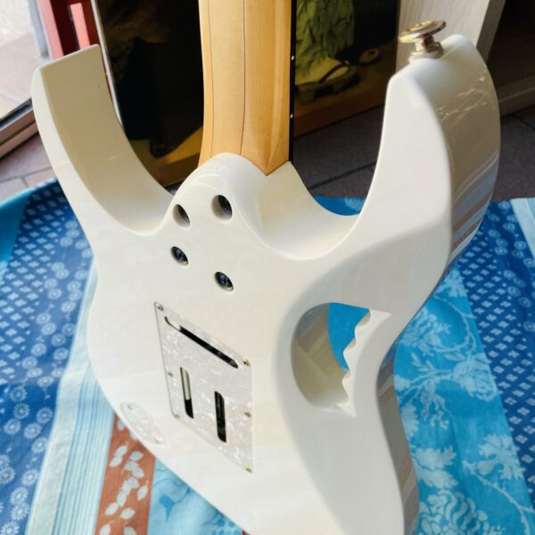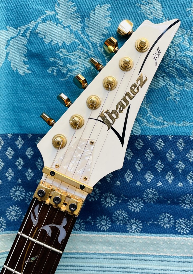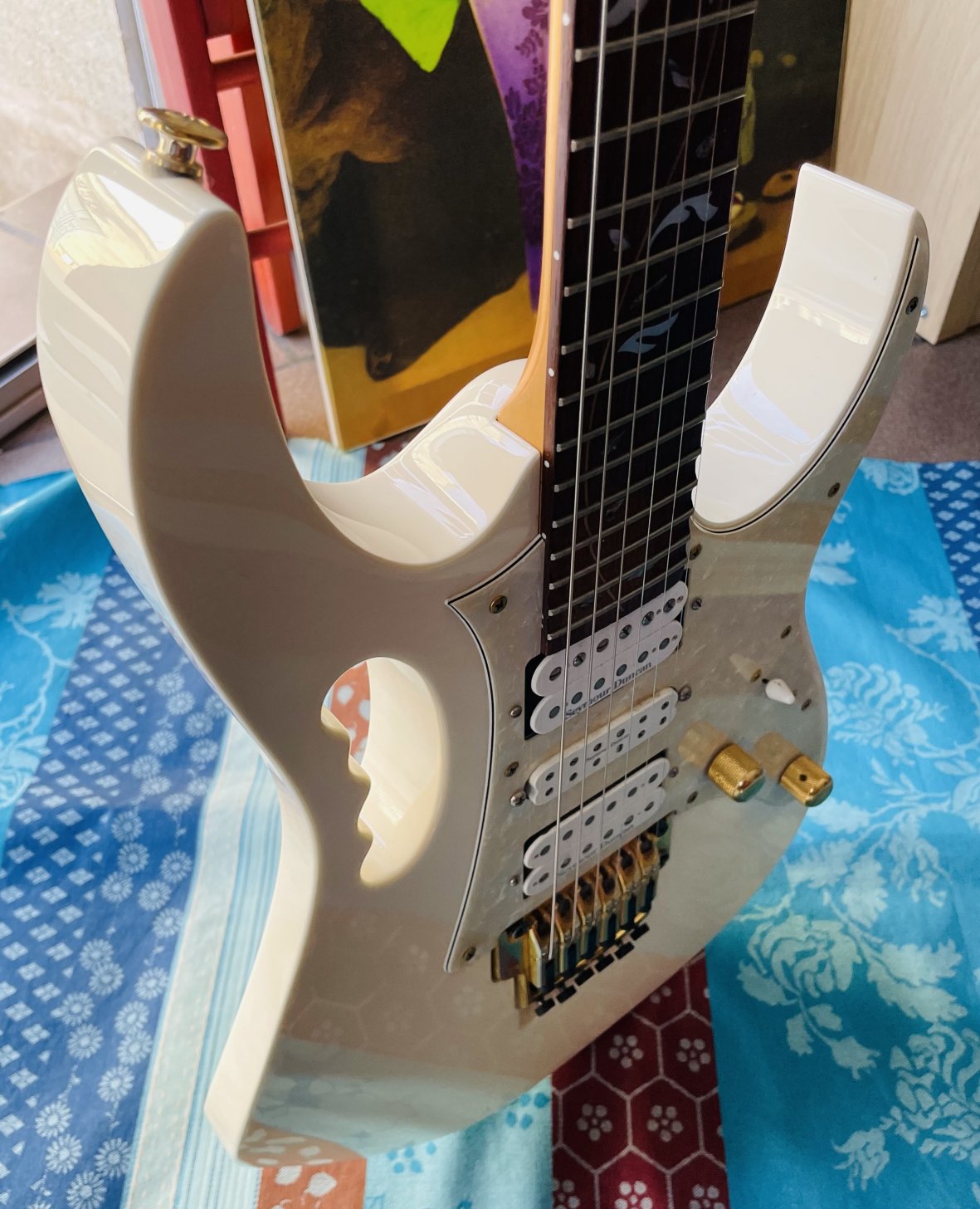 en bon état pour son âge (les deux potards mériteraient un peu de bombe contact), c’est la couleur White qui a un peu jaunie sur le corps. Appartenant à un guitariste professionnel, elle est réglée avec des cordes proches du manche et un tirant 09/42. C’est la version Japonaise avec une très belle finition ! Les micros ont été changés par des Seymour Duncan que nous avons pu faire vérifier avec le luthier THEBE qui confirme aussi que les micros de côté sont bien ceux d’origine (Ibanez V2 Japan). Micros Seymour Duncan SH2 (manche), TB5 (Chevalet) et SJB6 (milieu).