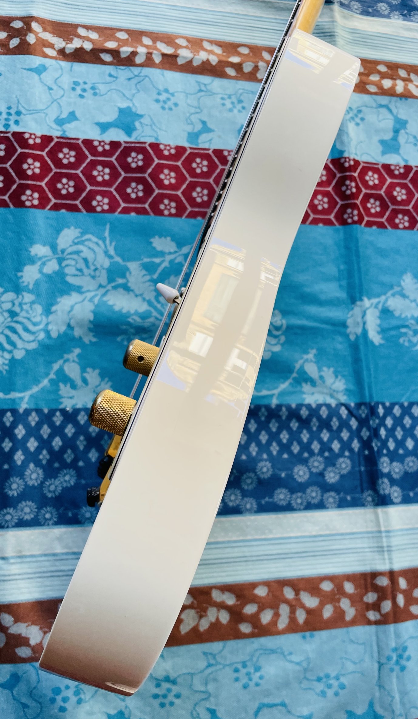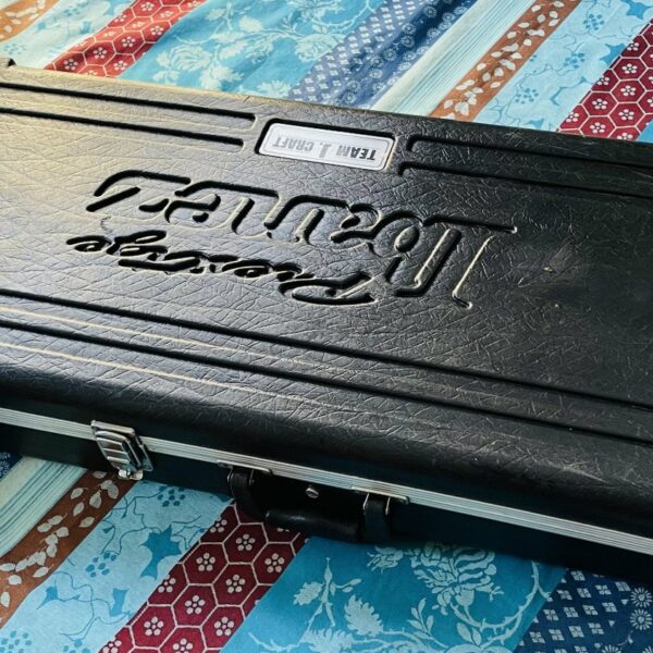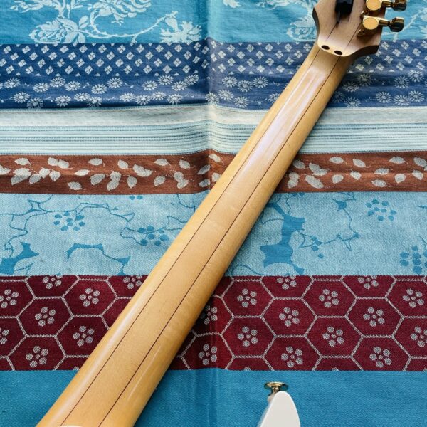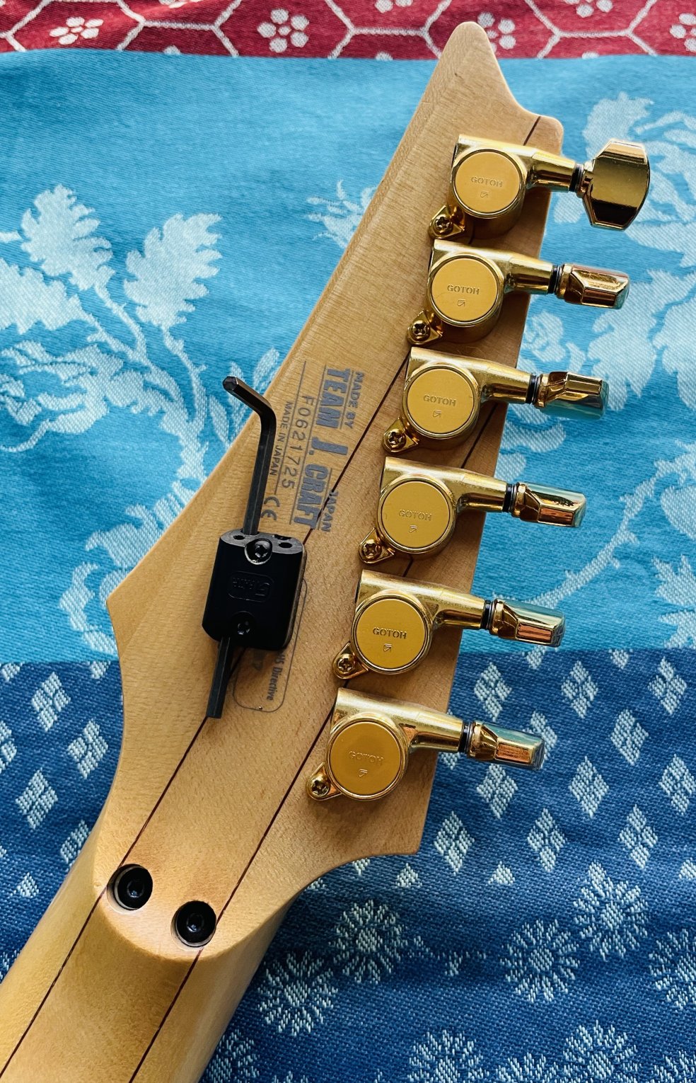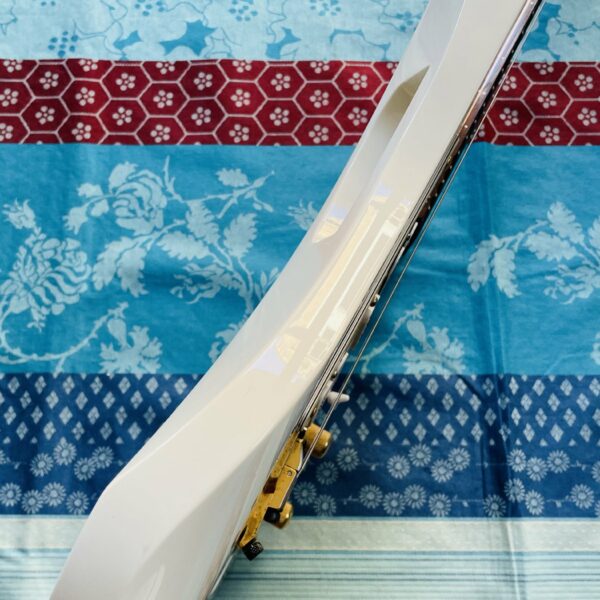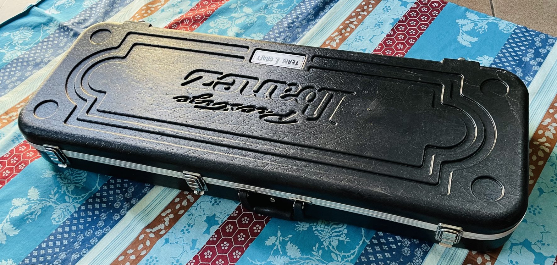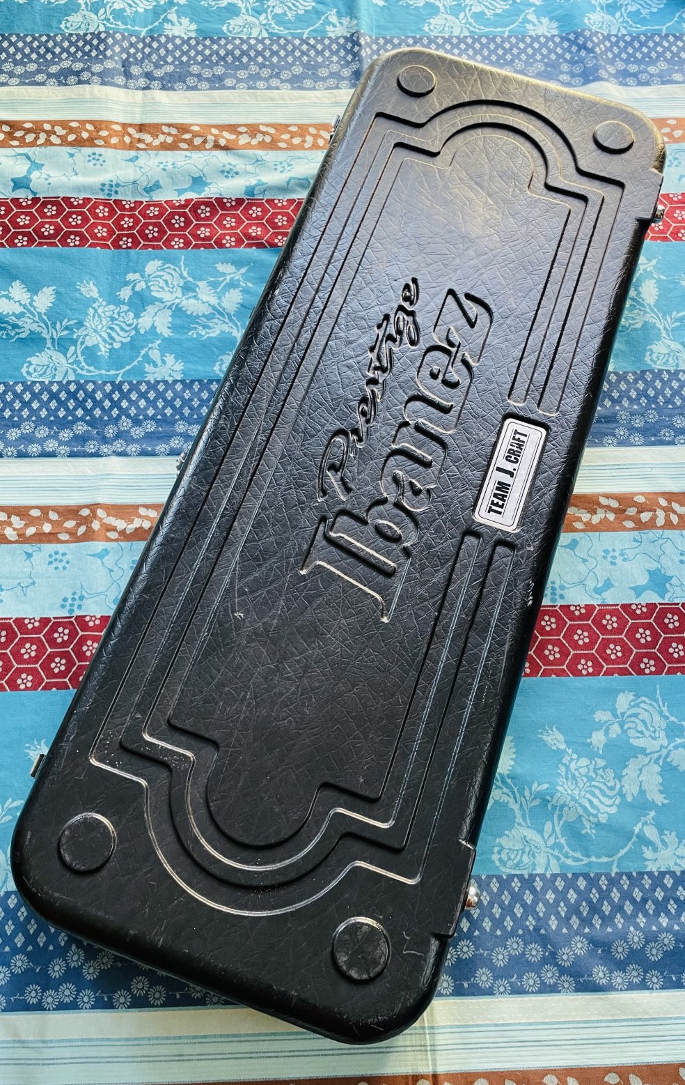 en bon état pour son âge (les deux potards mériteraient un peu de bombe contact), c’est la couleur White qui a un peu jaunie sur le corps. Appartenant à un guitariste professionnel, elle est réglée avec des cordes proches du manche et un tirant 09/42. C’est la version Japonaise avec une très belle finition ! Les micros ont été changés par des Seymour Duncan que nous avons pu faire vérifier avec le luthier THEBE qui confirme aussi que les micros de côté sont bien ceux d’origine (Ibanez V2 Japan). Micros Seymour Duncan SH2 (manche), TB5 (Chevalet) et SJB6 (milieu).