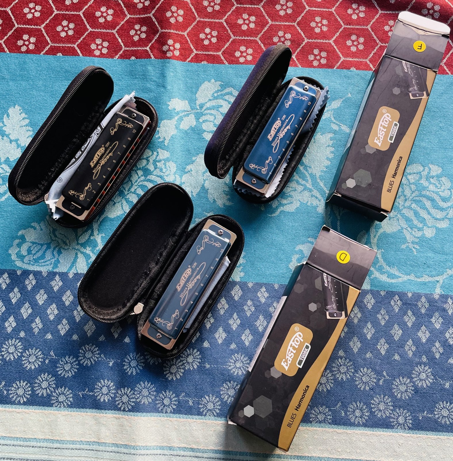 3 Harmonicas Eastop blues harmonica G / F / D, housses, boites