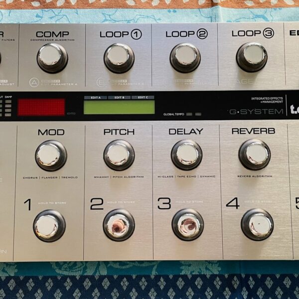 en bon état, quelques traces visibles mineures. Testé et fonctionnel. Il n’est pas léger et en plastique, c’est du robuste, en aluminium massif avec des gros switches et de la sérigraphie bien visible. Il valait neuf 580 €. Le pédalier demande un peu de prise en main. En résumé, vous avez au haut du pédalier une rangée de switches au pied qui sont aussi des Encoders pour naviguer dans les presets manuellement, modifier les paramètres de vos sons, au bas vous avez deux rangées de switches pour pied uniquement. Il parait compliqué mais il faut simplement connaitre le bon chemin à prendre pour charger les Presets, activer les Loopers, le Switch Boost est direct. La notice est Française mais il faut pratiquer.