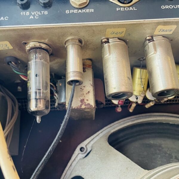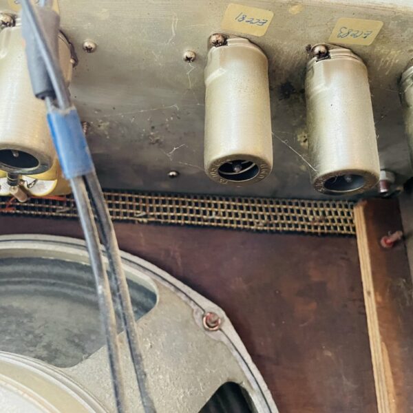 l’ampli s’allume, on a du son sur le second canal mais pas le premier, on sent bien qu’il marche mais qu’il a besoin d’une bonne révision et changement de certaines lampes, nous ne l’avons pas vérifié avec un devis de pro, nous le vendons tel quel et à faire réparer vous-même. Valeur estimée d’occasion réparé entre 500 € et 600 €