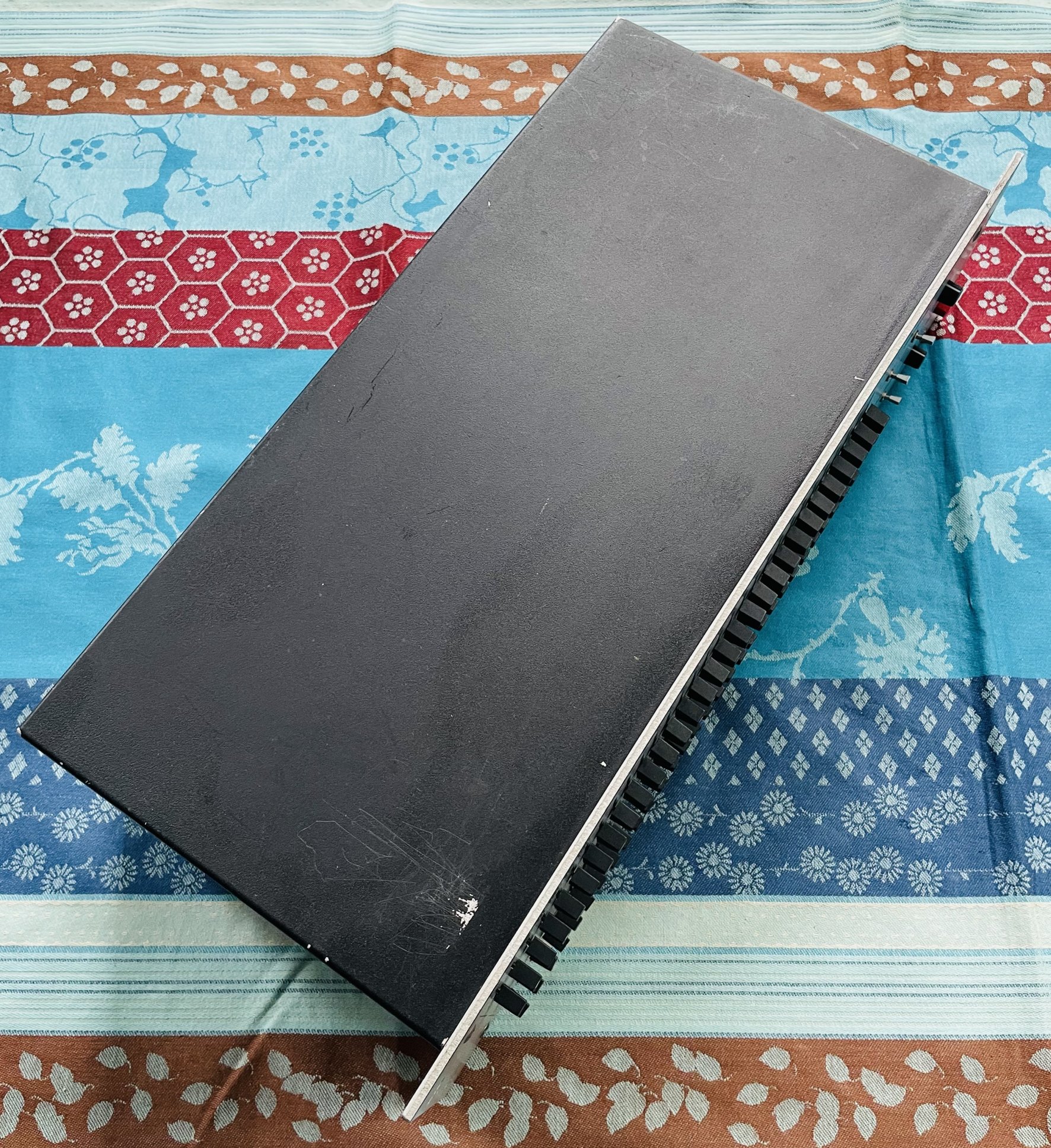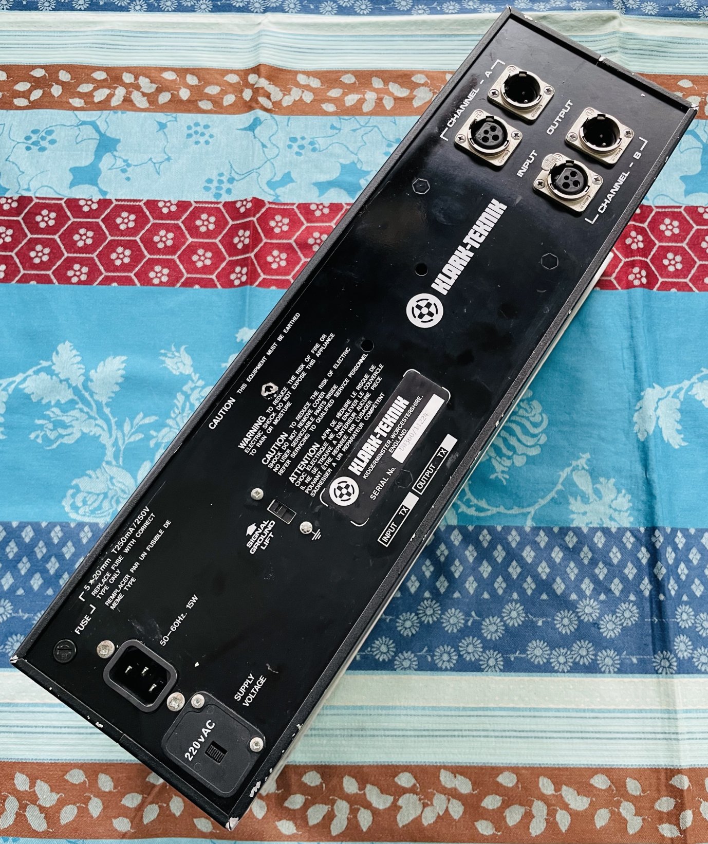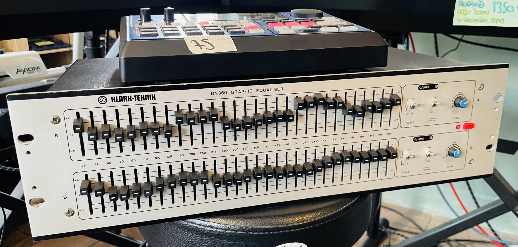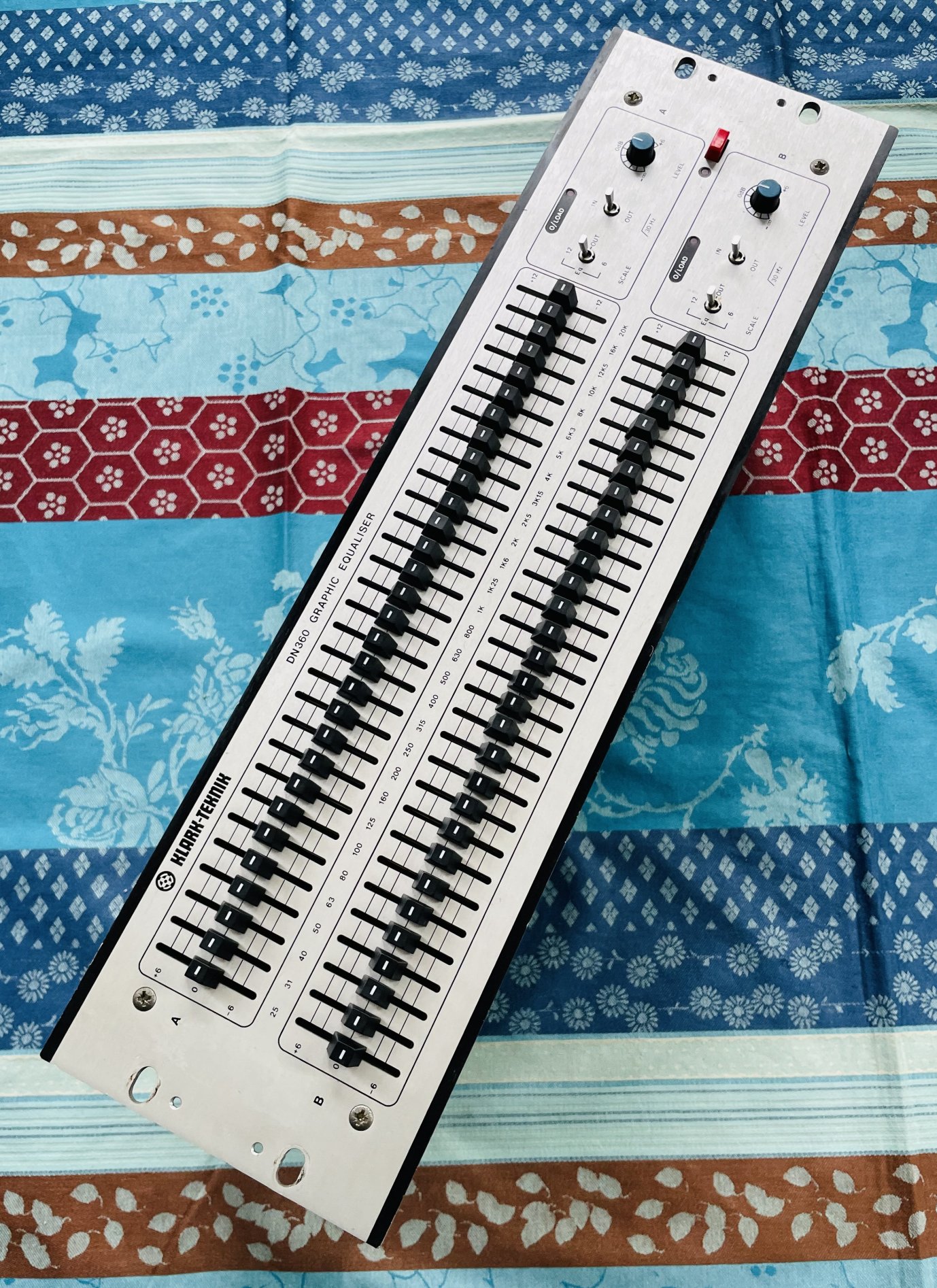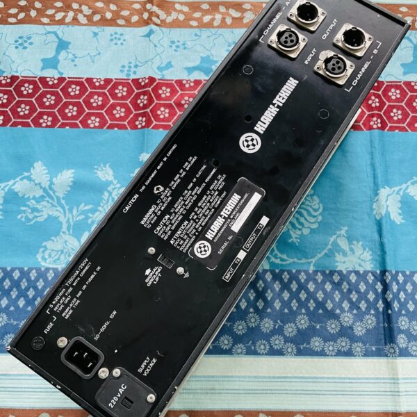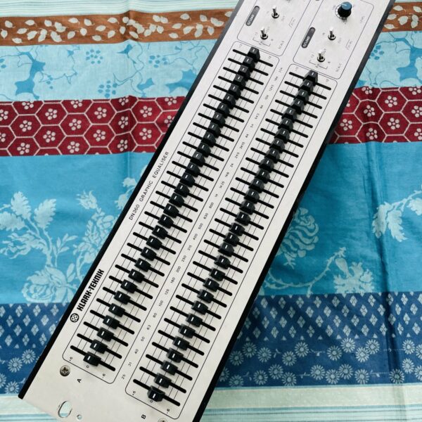 en bon état devant mais on observe un peu d’usure sur les prises XLR au dos (la partie métallique qui sert de sécurité pour tenir le câble, cela tient cependant bien et tout va bien), testé et fonctionnel, pas de grésillement. Cet égaliseur graphique possède deux canaux 30 bandes aux normes ISO et un filtre passe-haut à 30Hz.