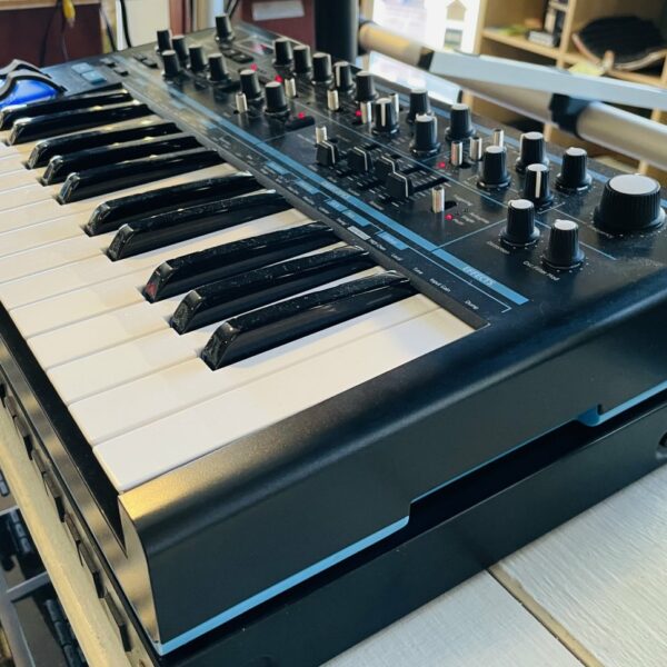 en très bon état et fonctionnel, il y a encore le film plastique sur l’écran, c’est un chouette synthé super efficace, compact, léger et inspirant. Bien que monophonique il peut jouer deux notes
