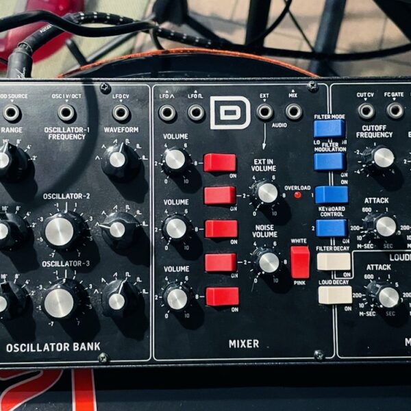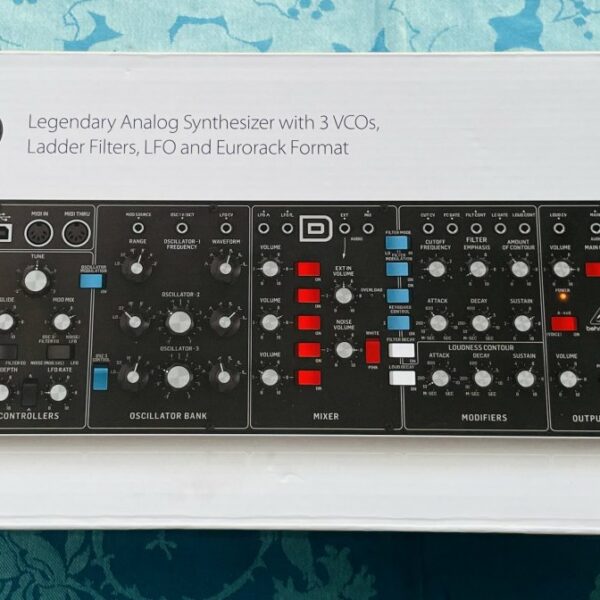en bon état malgré quelques petites traces sur un bord, la façade est très propre, testé en midi avec clavier maitre, le synthé est bien fonctionnel. Une copie compacte du fameux Moog Minimoog avec des fonctions ajoutées (filtres, connectiques modulaires, usb)