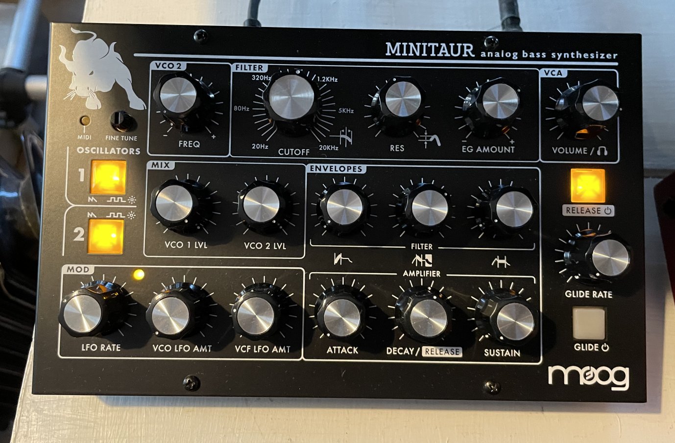 Synthé monophonique Moog Minitaur n°MT19733, boite d’origine, notice