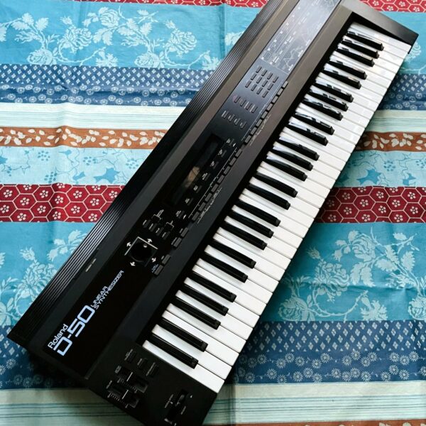Synthétiseur Roland D-50 n°F998663 (1989, Japan), 3 cartes (3 autres à vérifier), sons d’origine, pile neuve