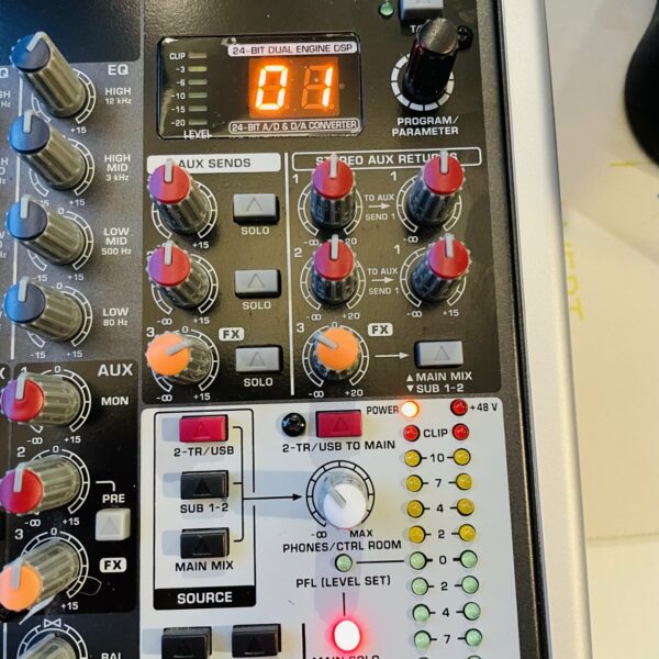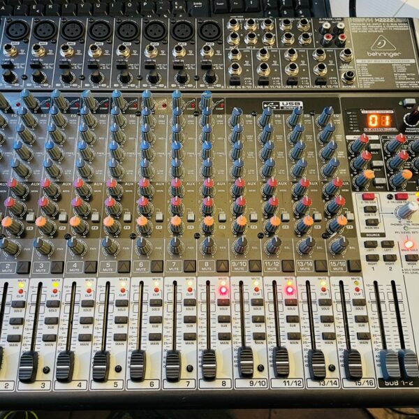 en bon état, quelques traces mineures (scotch ôté sur les bords et un peu au dos, testée avec un microphone Sennheiser, tout semble bien fonctionnel. 22 canaux, effets intégrés, 8 entrées micros XLR…